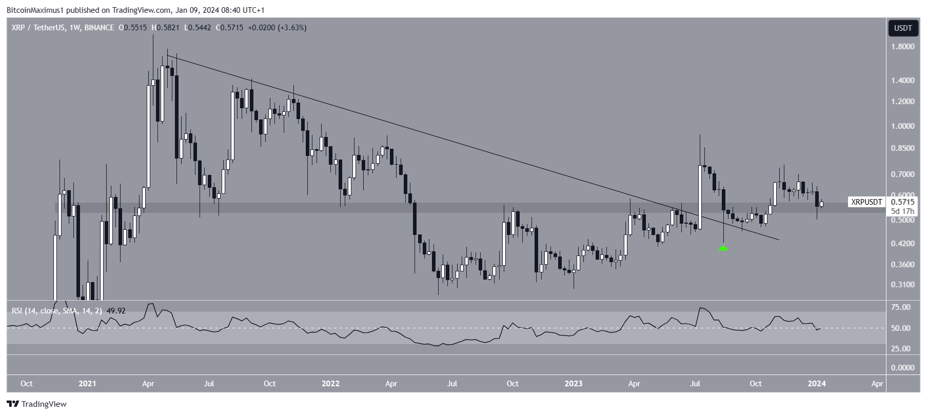 The price action shows that XRP has fallen under a shorter-term descending resistance trend line since July 2023. The trend line has been validated numerous times, most recently in December (red icon).