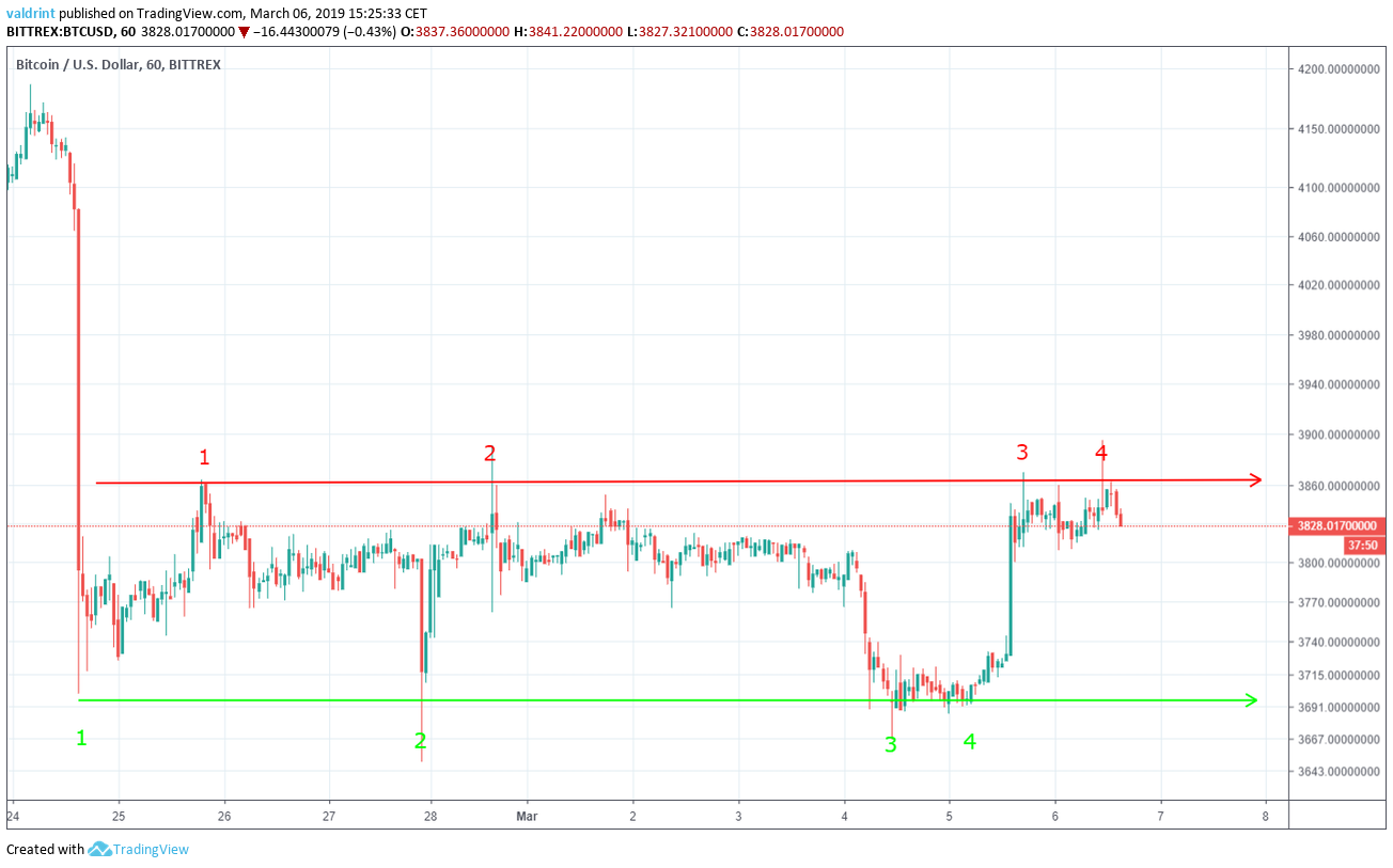 The price of BTC on Bittrex is analyzed in 1-Hour intervals from Feb 26 to Mar 6.