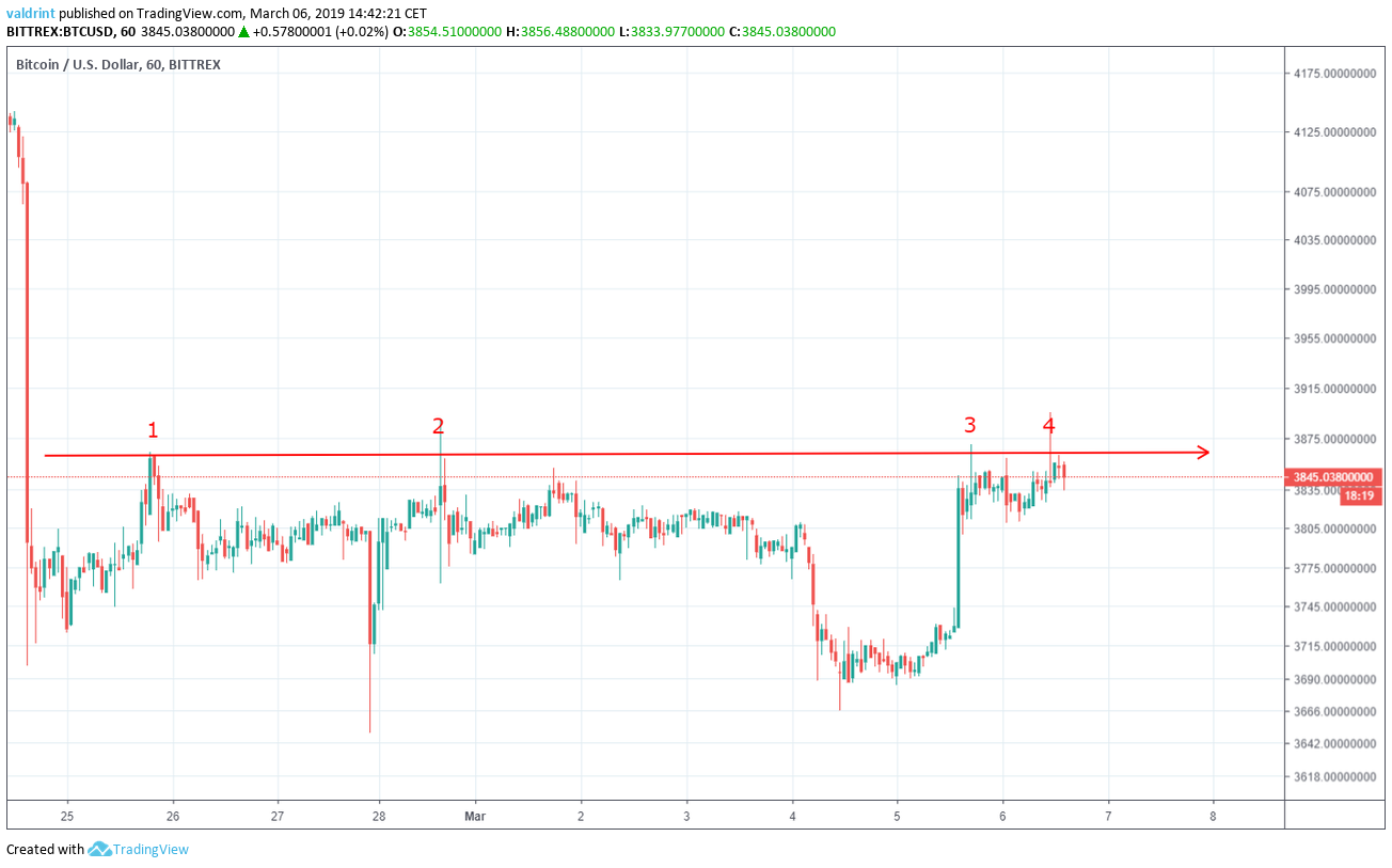 The price rebounded to a level close $3870 on Feb 25. The price reached the same level several times. The horizontal resistance line is created by tracing these successive highs.