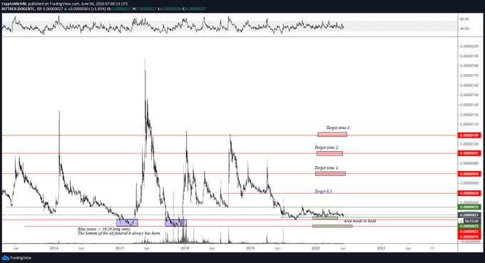 The Dogecoin (DOGE) price has been trading inside a range of 25-34 satoshis since October 2019. Currently, there are no immediate signs that the price will break out or down from this range.