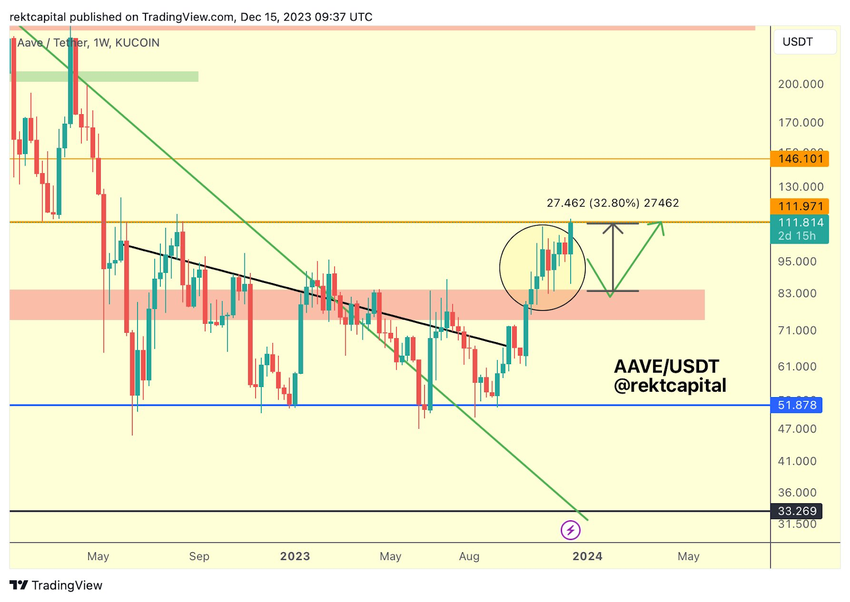 Here, Rekt Capital is referring to AAVE’s consolidation pattern that allowed the price to establish a base before breaking out upwards. This successful retest of prior resistance at $111 after breaking a downtrend signals a potential new uptrend underway.