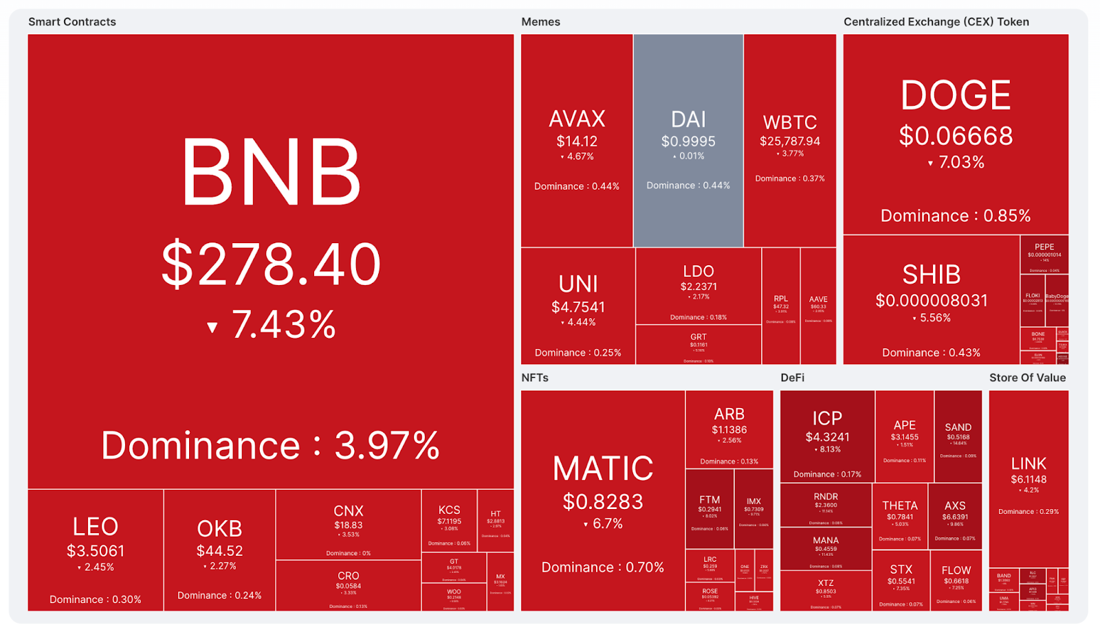 The crypto market heatmap from CoinMarketCap makes for grim viewing, with the vast majority of coins and tokens in the red over the past day.