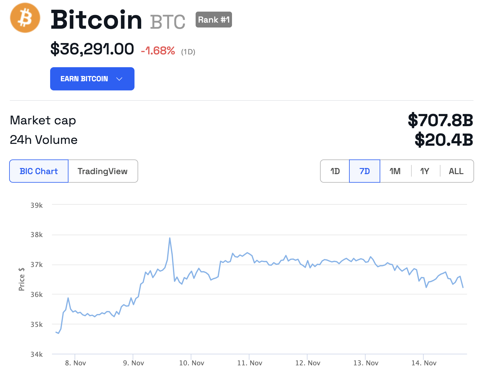 Bitcoin is currently fluctuating around $36,134, and is down 1.8% in the last 24 hours. Over the past seven days, its price has risen 3.8%.