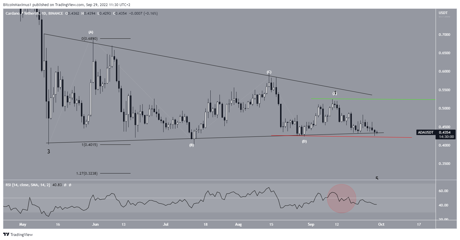 The daily chart shows that ADA has reached the support line of a symmetrical triangle that has been in place since May 12.