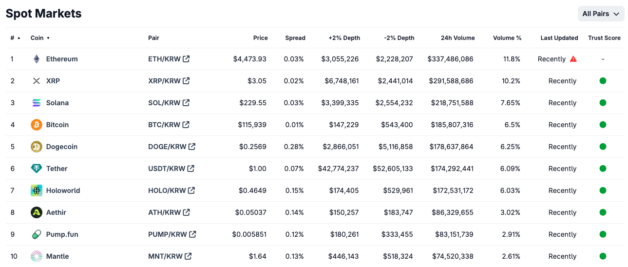 Data from the Digital Asset eXchange Alliance (DAXA), an association of Korean crypto exchanges, shows that as of late August, Bithumb listed 406 tokens—roughly 1.5 times more than Upbit’s 260. CoinGecko figures place Bithumb’s market share at 46%, compared with Upbit’s 50.6%.