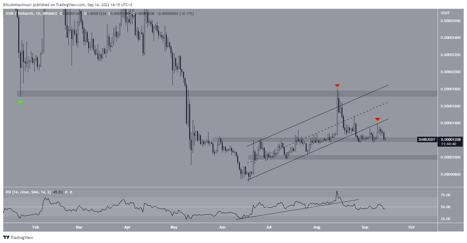 SHIB had been trading inside an ascending parallel channel since June 18. While doing so, it managed to reach a high of $0.000018 on Aug. 14.