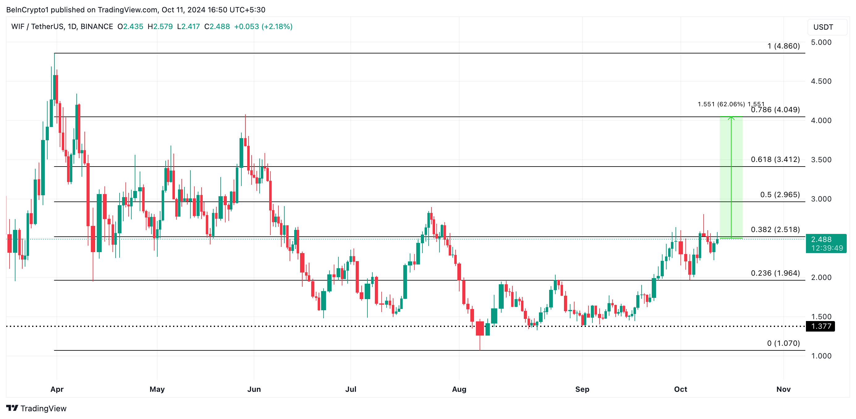 WIF is currently trading below the critical $2.52 resistance level, which has remained a hurdle since June. Over the past two weeks, it made two unsuccessful attempts to break through this level. However, the altcoin has surged by 12% in the last 24 hours and is now positioned to challenge this key resistance again.