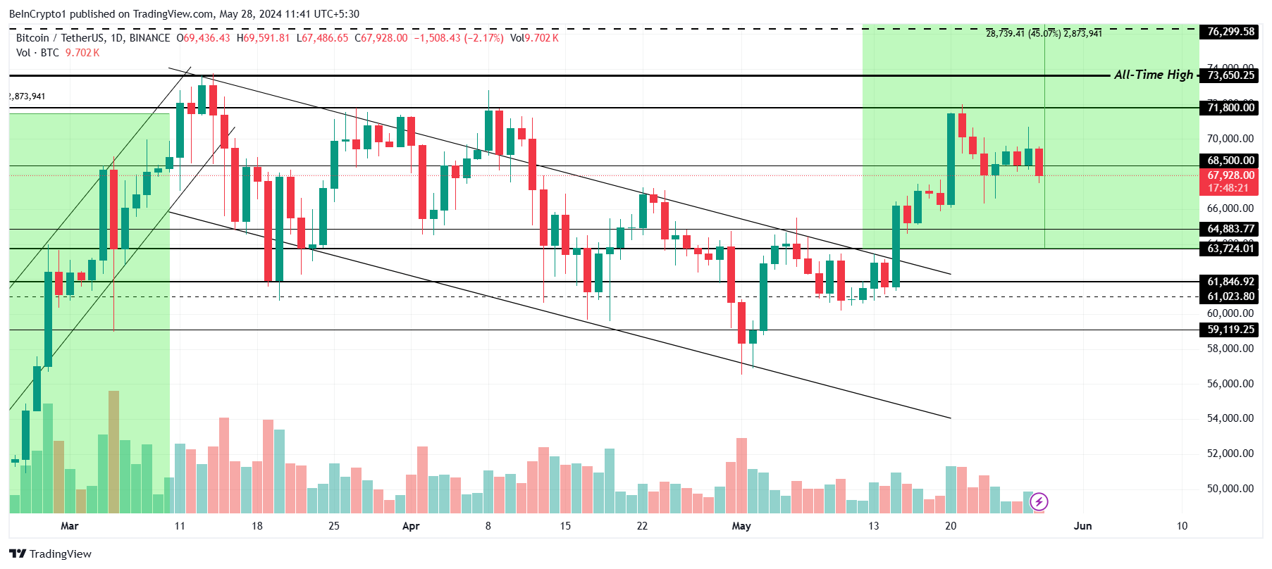 Given that Mt. Gox’s $5 billion BTC move was today’s market mover, Bitcoin’s price was bound to take a hit. The crypto asset fell by a little over 2%, which resulted in BTC losing support at $68,500. This is a critical support level; cementing it as a support floor is essential for noting recovery.