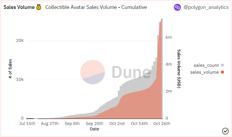 Update Oct. 26, 10:oo UTC: In the past 2 days, Reddit Avatar collectibles saw a 112% increase in volume, now standing at $7.43 in total sales volume from 25.7K sales, averaging $288 per sale.