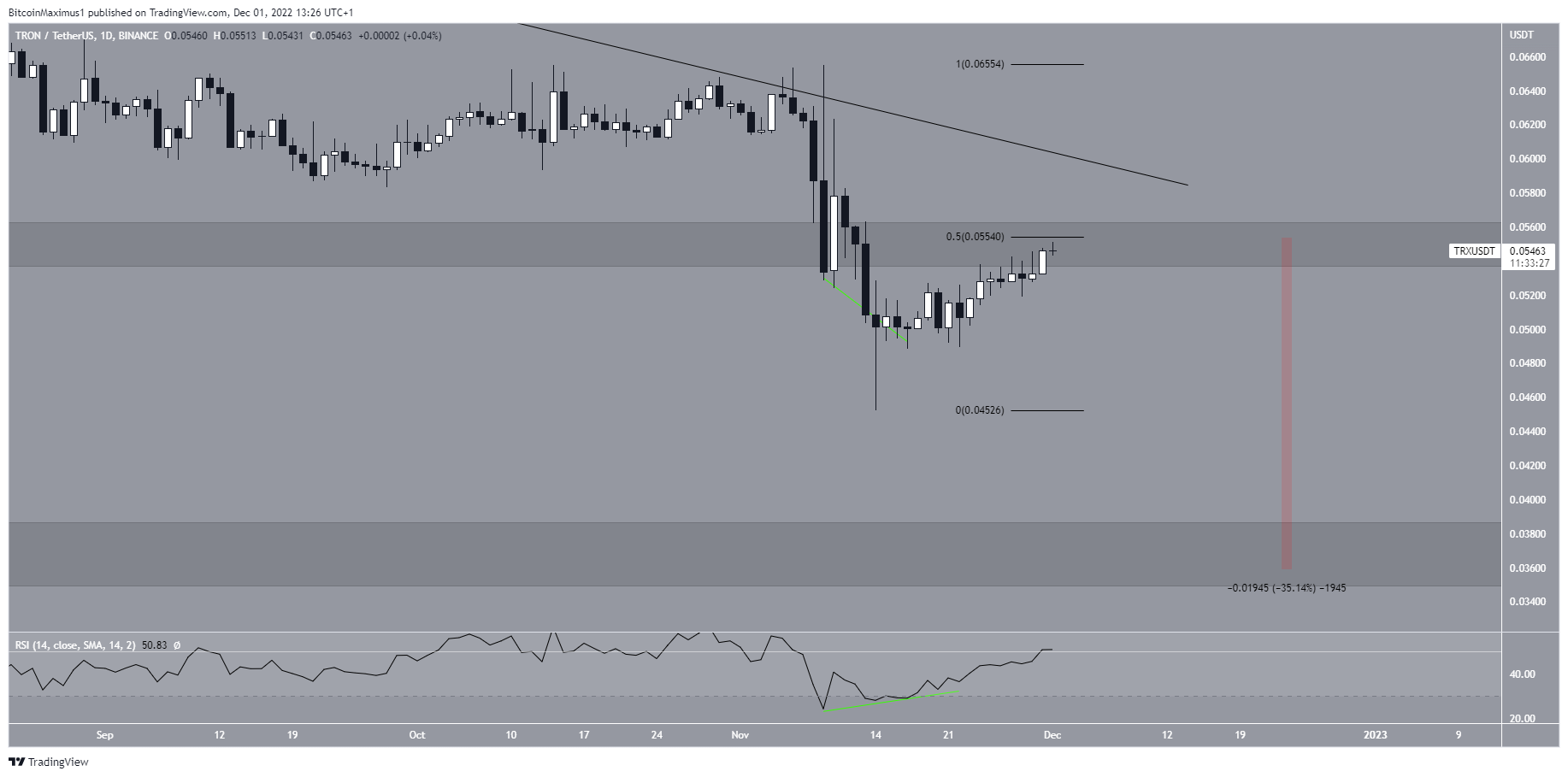 If a rejection occurs, the TRX price could fall all the way down to the previously outlined support area of $0.036.