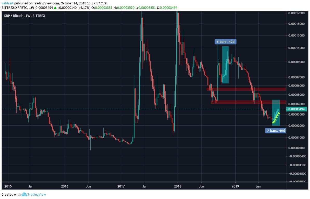 In early September, the XRP price reached an almost two year low of 4233 satoshis. Since then, it has been on an upward trend.