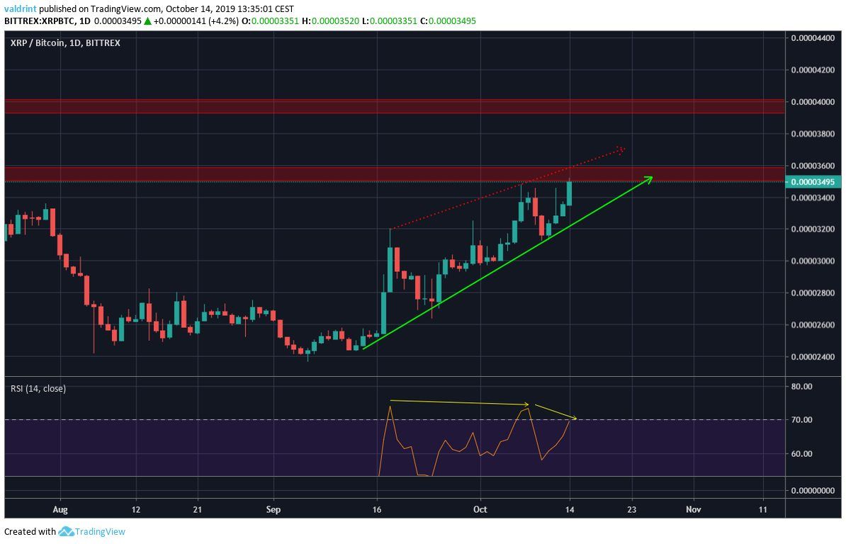 The first thing we can notice when looking at the XRP chart are the two resistance areas. While the price has reached the first one at 3550 satoshis, the second one is at 4000 satoshis.