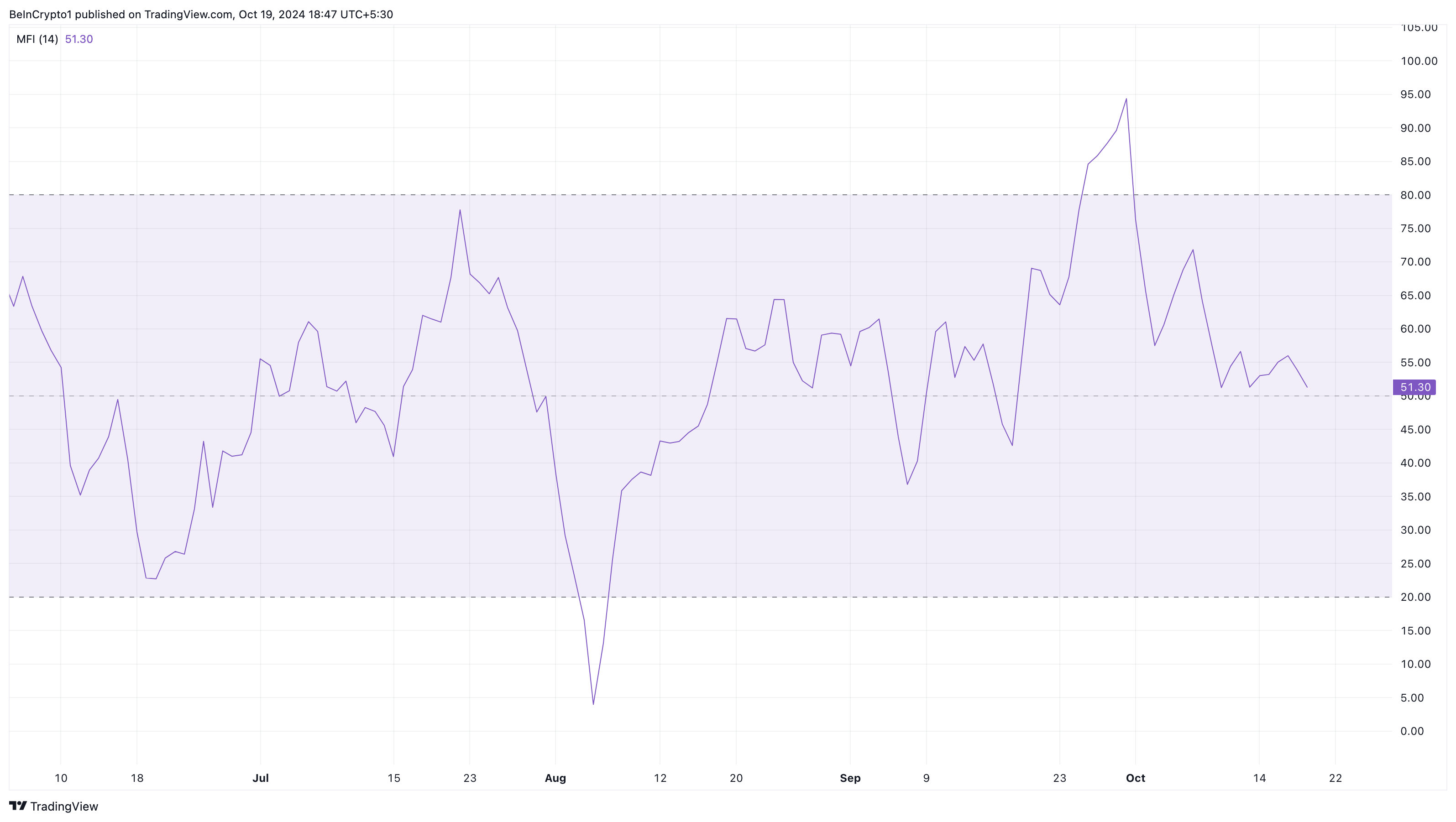 The Money Flow Index (MFI) is another indicator signaling a potential correction for WIF. The MFI assesses both volume and price to gauge buying and selling pressure in the market.