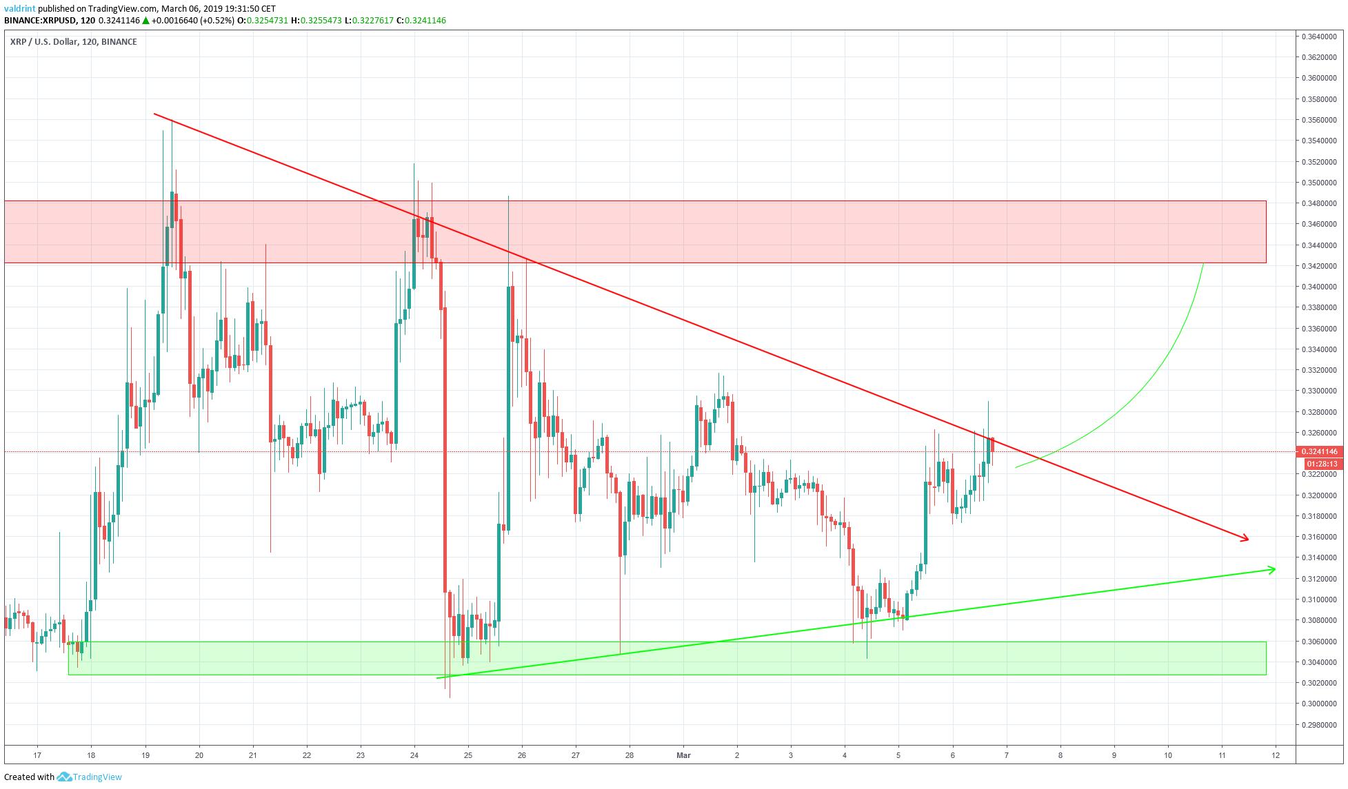 After the sharp drop of Feb 24, the price reached a low of near $0.3. It continued to create higher lows.
