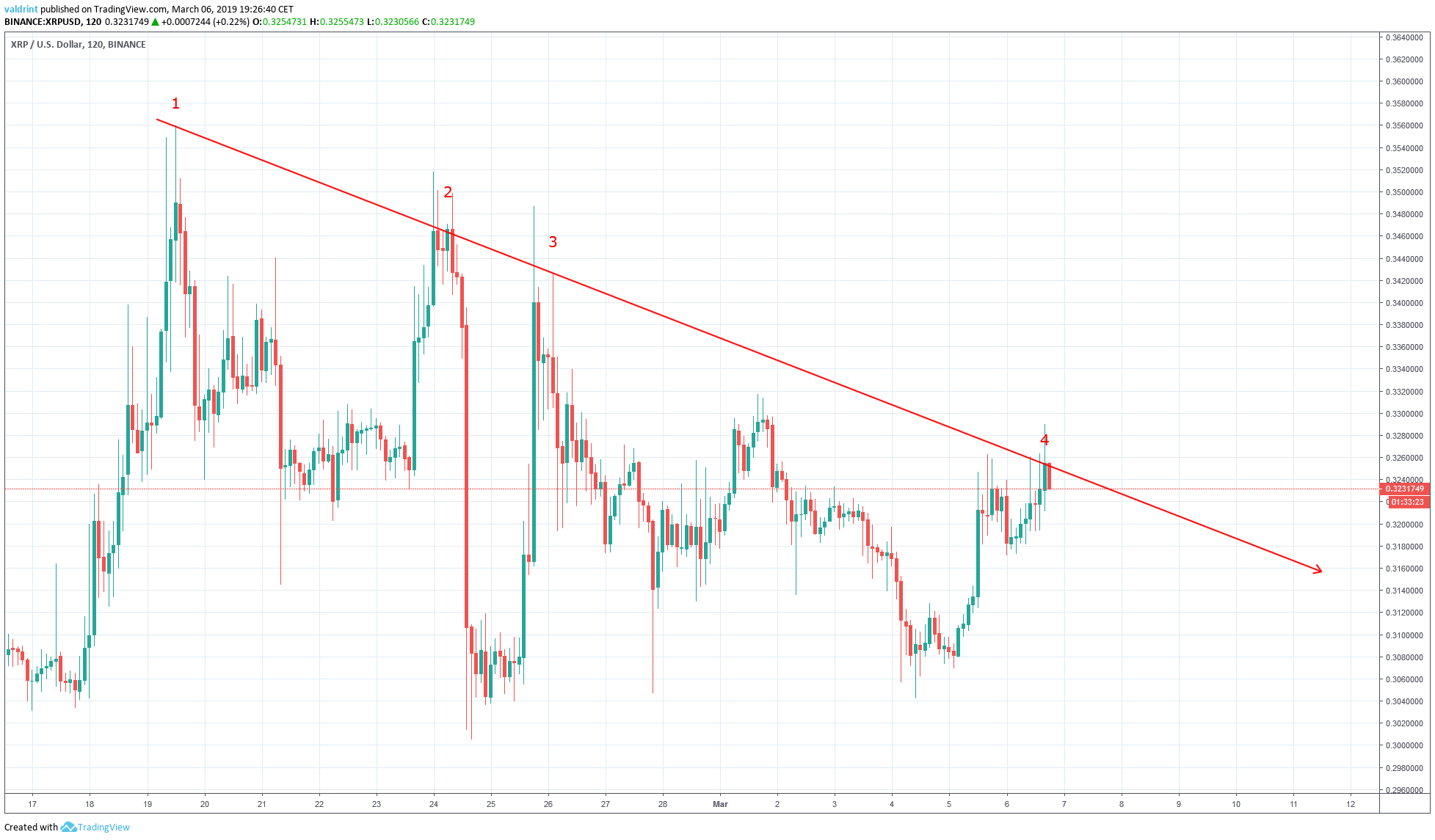 A market-wide flash crash followed. XRP lost over 10% of its value. A quick recovery saw a third lower high reached on Feb 26.
