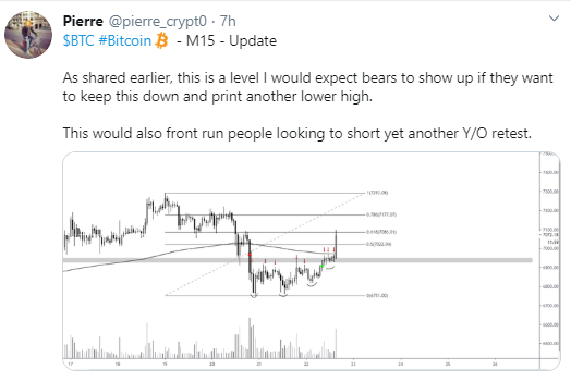 The BTC price increased considerably on April 22. While it began the day at $6,818, it was trading at $7,100 at the time of writing. However, it faces an uphill climb in case it wants to continue moving upwards. Pierre_Crypt0 stated that the price is approaching an important resistance level, which is the final one that is likely to initiate a reversal. If not, the price could continue increasing towards new highs.