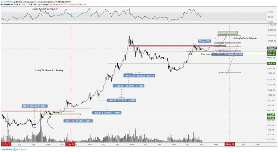 On September 4, 2019, @CryptoMichNL offered an analysis in which Bitcoin will not decrease below $8,500. In this scenario, BTC has already made a yearly low and will steadily increase to around $25,000 by May of 2020.