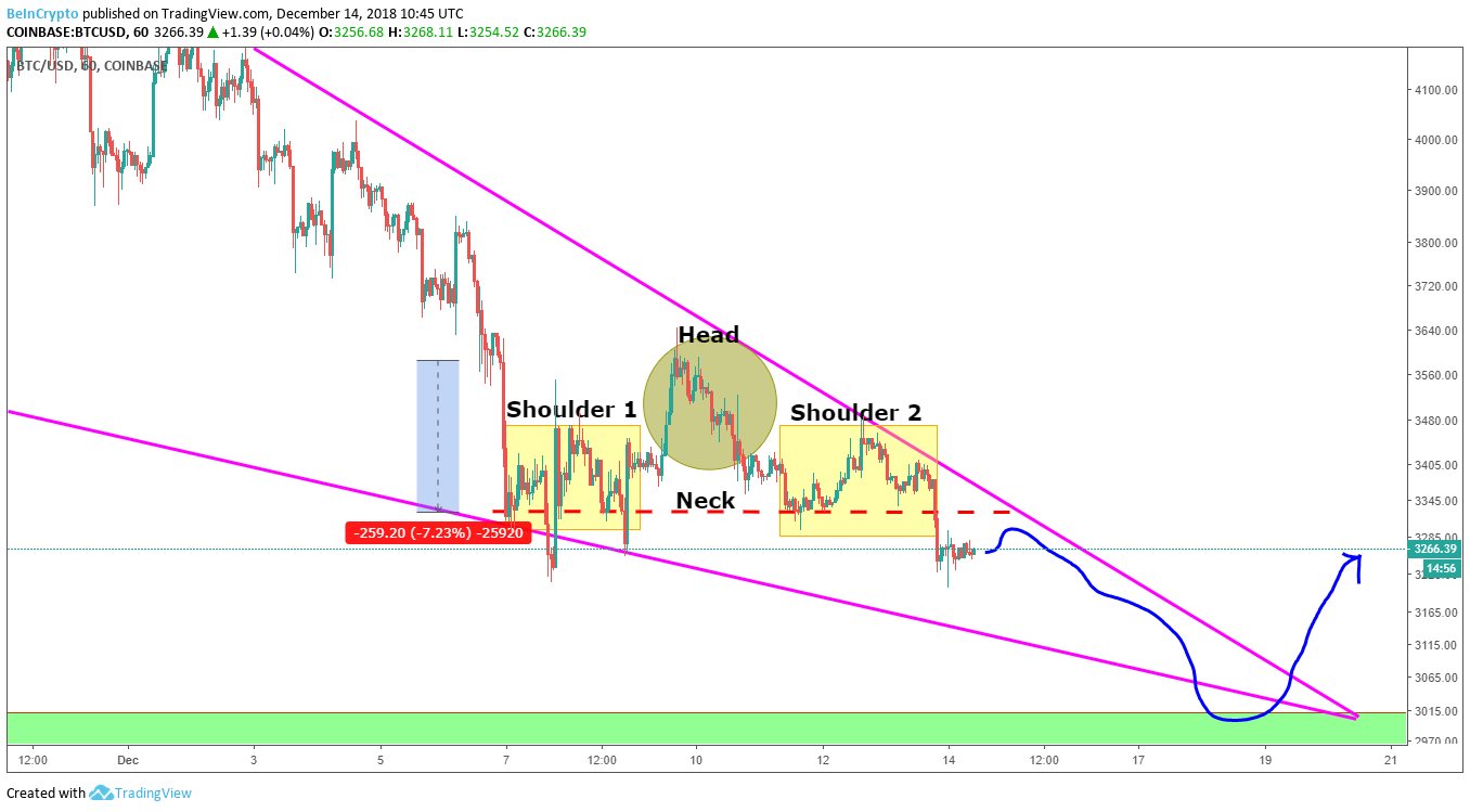 Since falling off of a cliff at $6,400, BTC has been bouncing between a descending wedge leading to the $3,000 to $2,800 range.