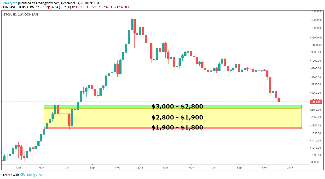 SponsoredThe weekly chart shows Bitcoin approaching a range with a bit more support, from $3,000 down to $1,800.