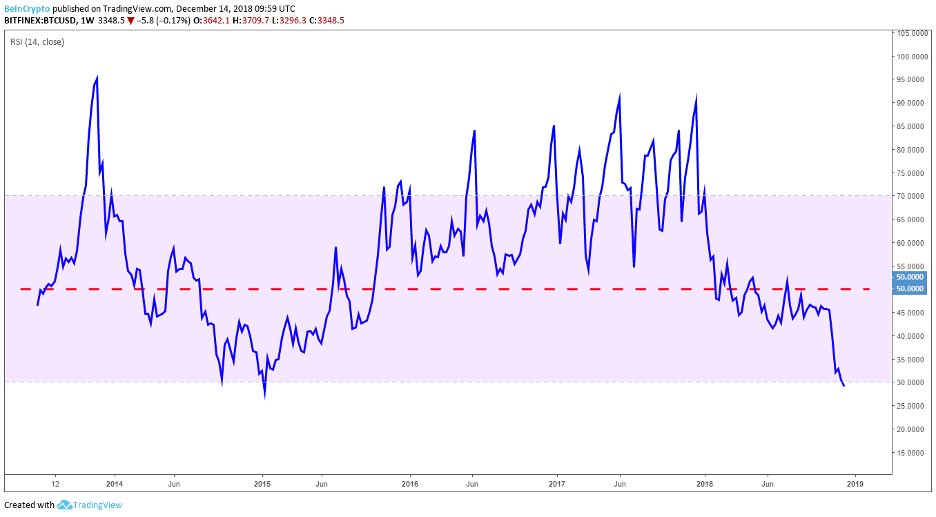 A look at the weekly relative strength index (RSI) shows Bitcoin (BTC) to be hovering slightly above its all-time low in January 2015, when it sunk to a value of 27.