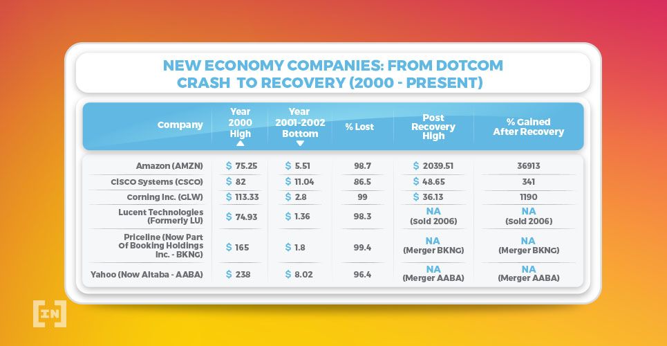 [bctt tweet=”So many parallels can be drawn between the cryptocurrency market throughout 2017 and 2018 and the Dotcom crash in the stock market in the year 2000.” username=”beincrypto”].