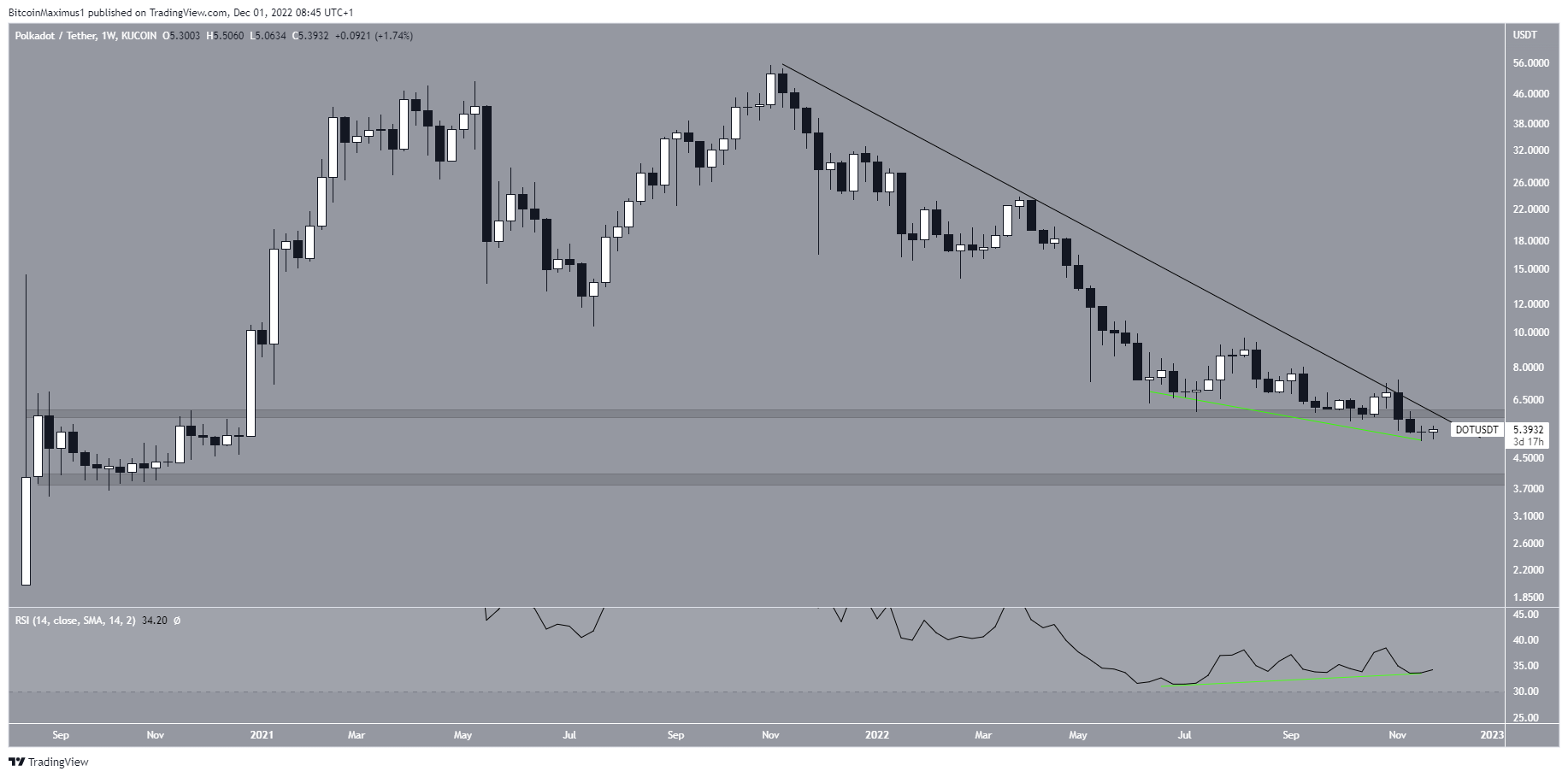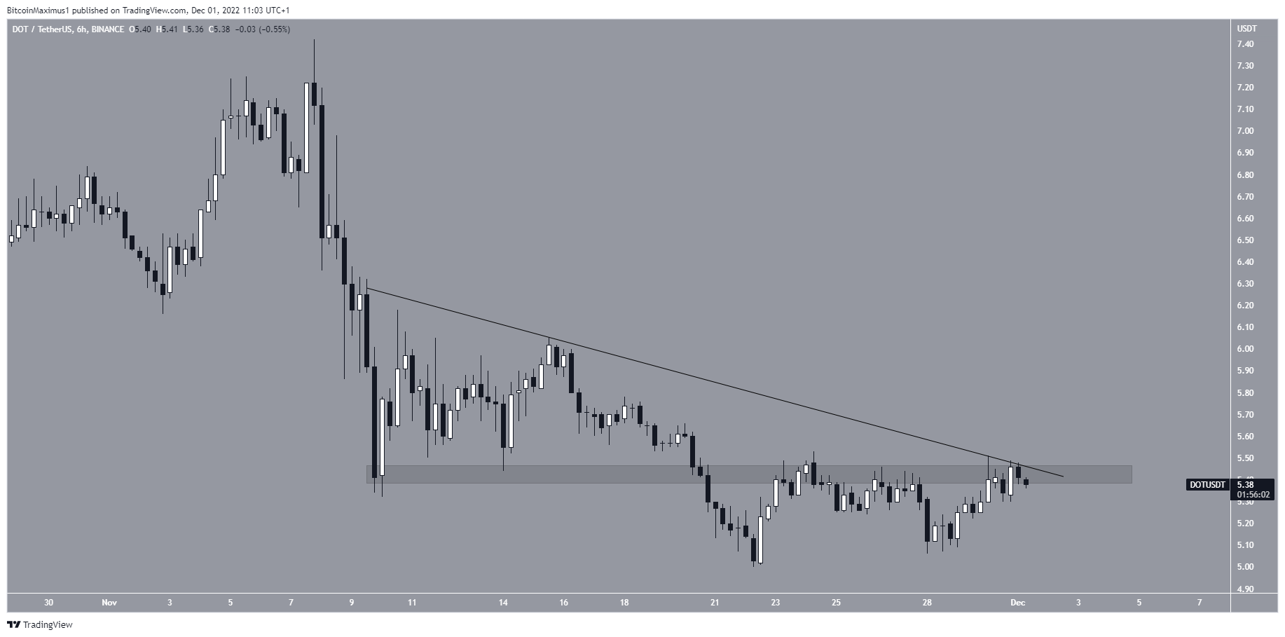 However, the six-hour chart shows that the DOT price is still following a descending resistance line and has been rejected by the $5.40 resistance area.