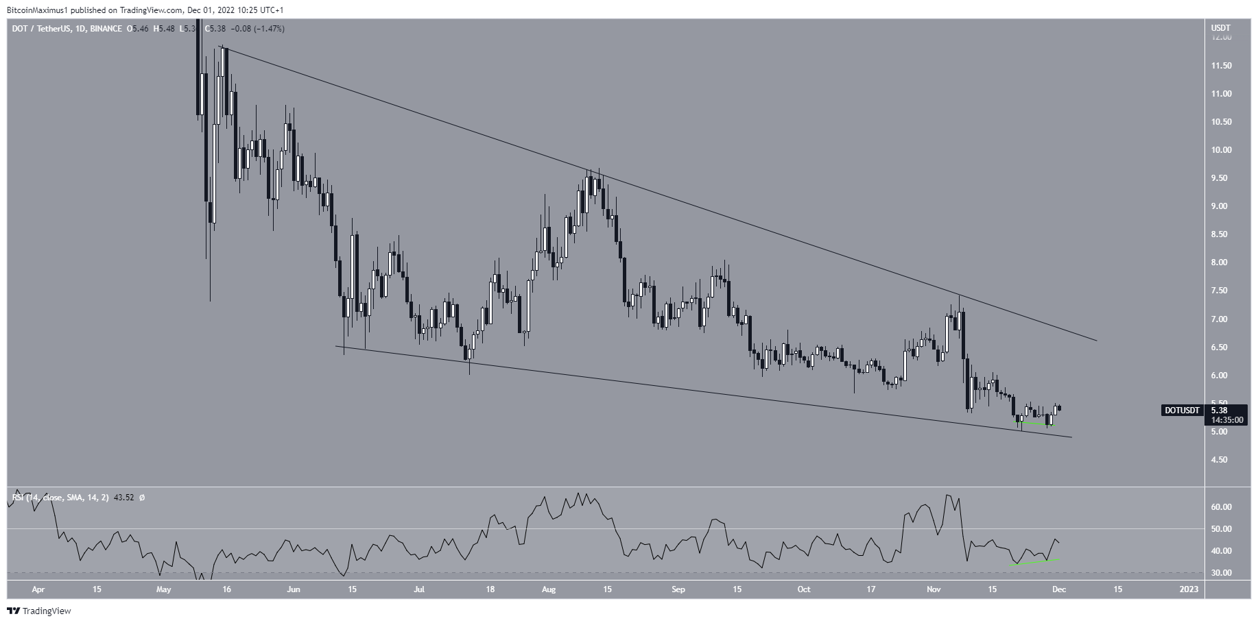 SponsoredThe Polkadot price bounced at the support line of the wedge on Nov. 22. Afterward, the daily RSI generated bullish divergence, catalyzing the current increase.