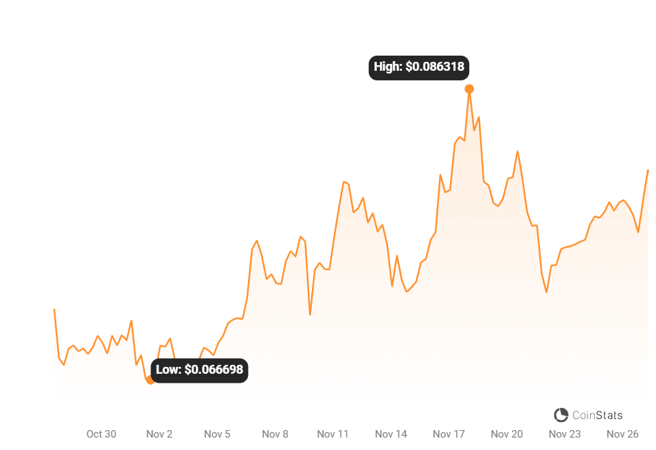 The popular meme coin Dogecoin (DOGE) saw its price rise above the significant $0.08 resistance level on Monday. This marks notable progress for DOGE, which has struggled to break past this level since mid-November.