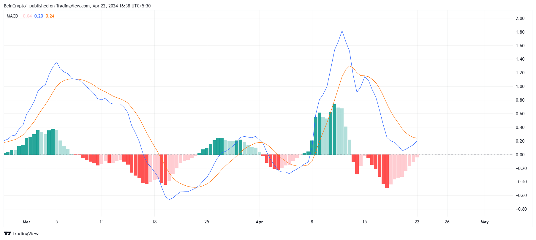 However, the Bitcoin halving changed the market sentiment from bearish to bullish, which is why the asset exhibits a potential crossover. The MACD (Moving Average Convergence Divergence) is a technical analysis indicator that tracks the relationship between two moving averages, signaling potential trend changes and momentum shifts in financial markets.