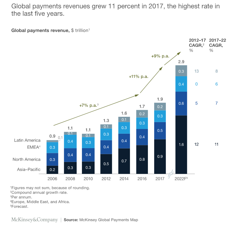 Figures from the global payments industry would suggest that this hasn’t turned out to be the case. According to McKinsey, revenues are set for a further 9% growth per annum by 2022.