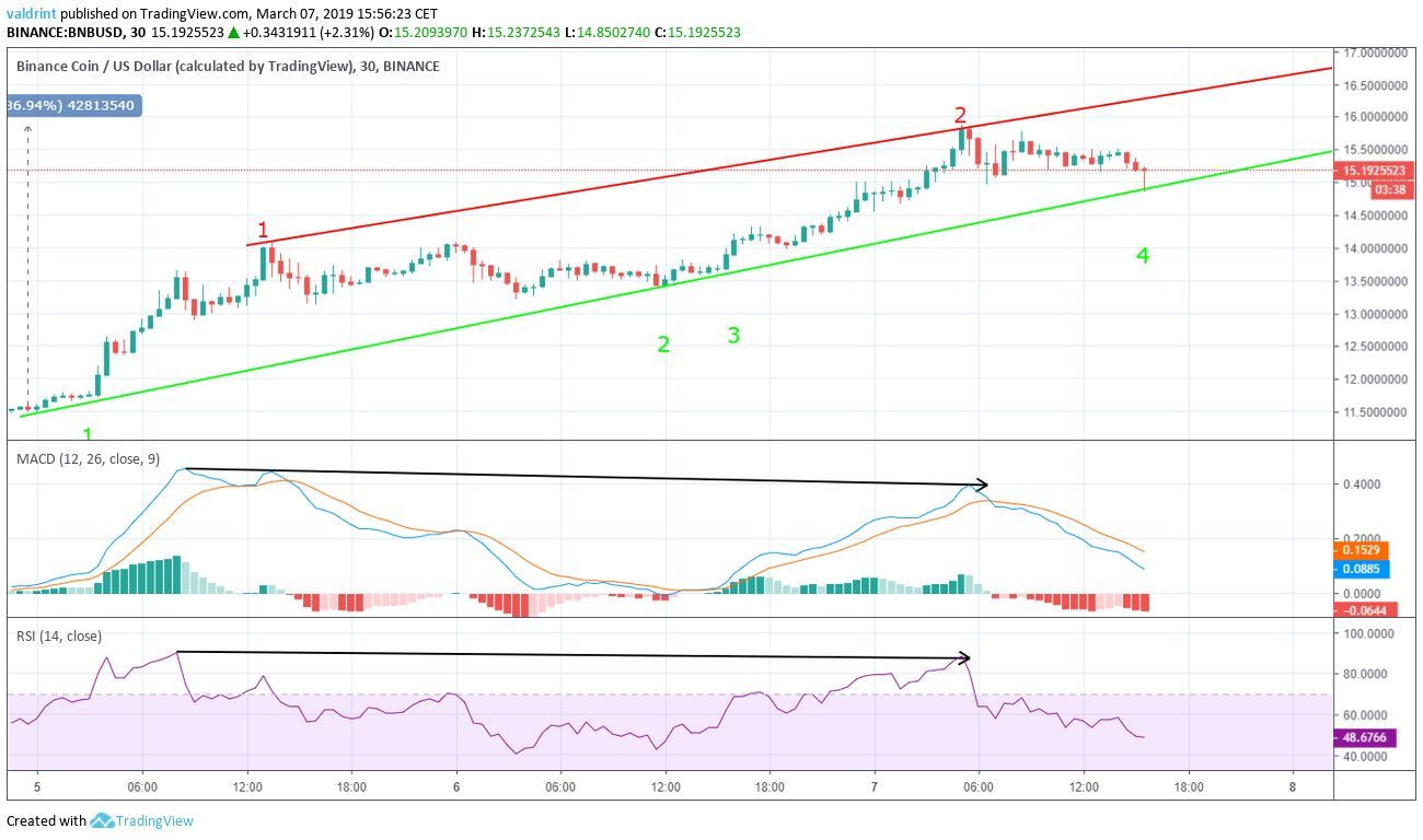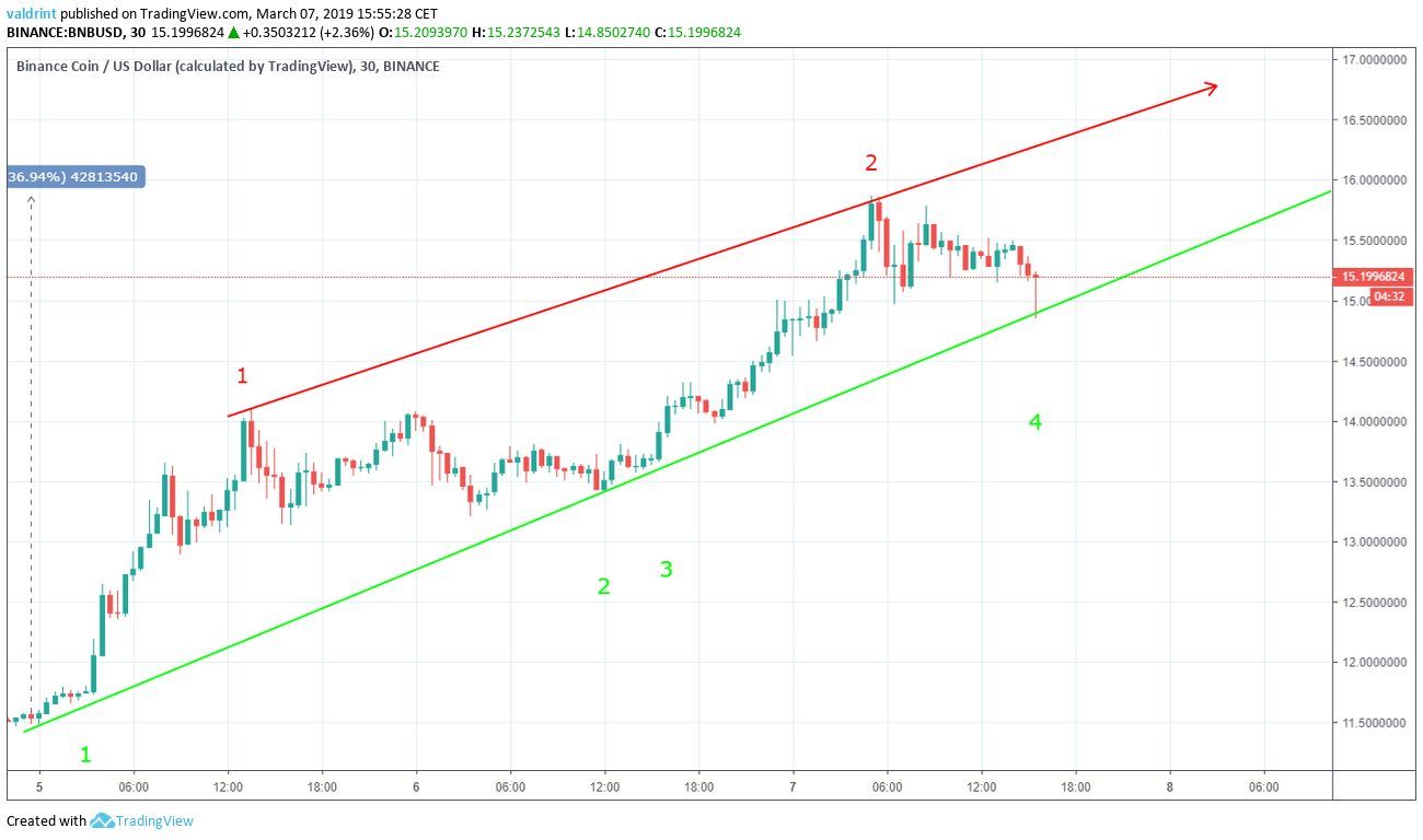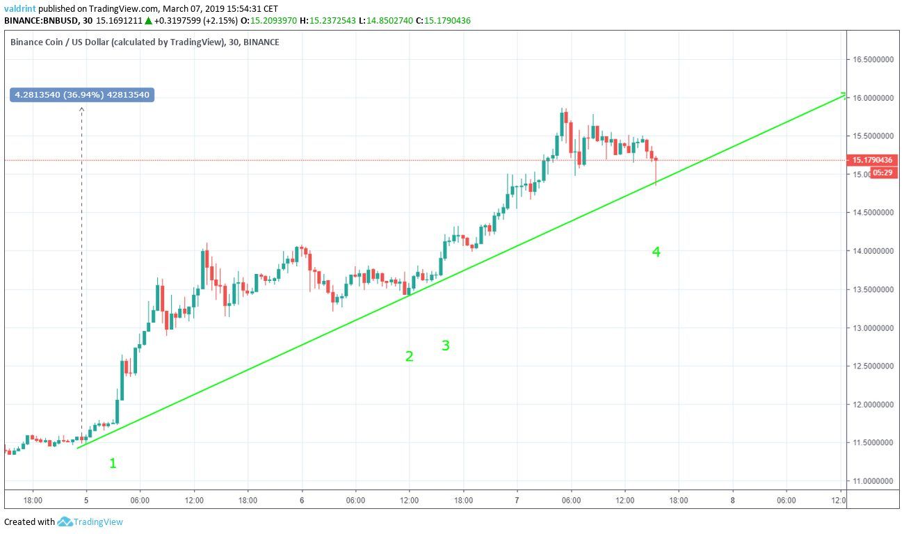 The price of BNB was $9.53 on Mar 5. It has made higher lows since. The ascending support line is created by tracing these successive lows.