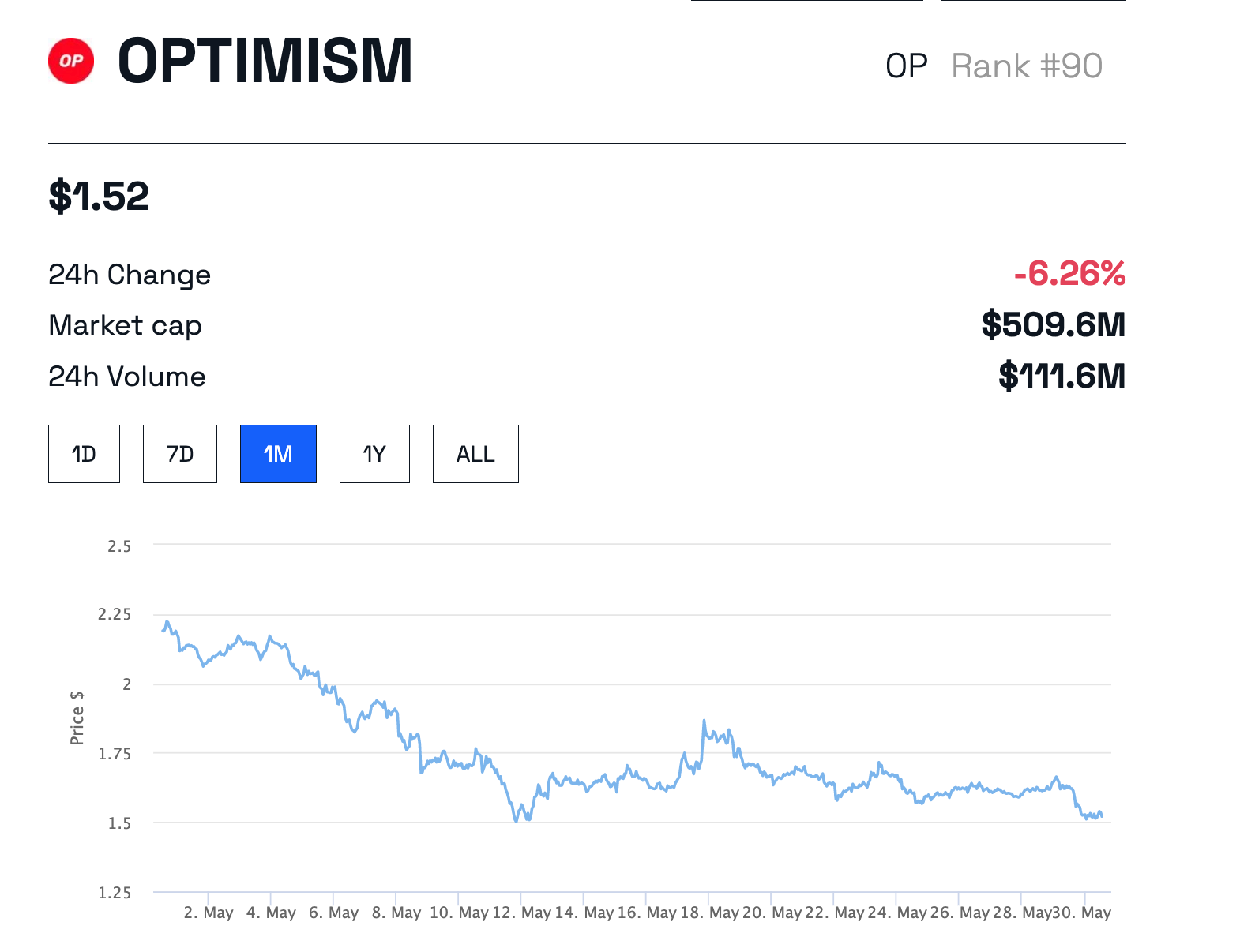 Due to unlocks, some community members are “expecting a huge price dump.” As of writing, the OP token is trading at $1.52, down by about 6.26% in the past 24 hours. It has a market capitalization of $509.6 million and ranks 90th.
