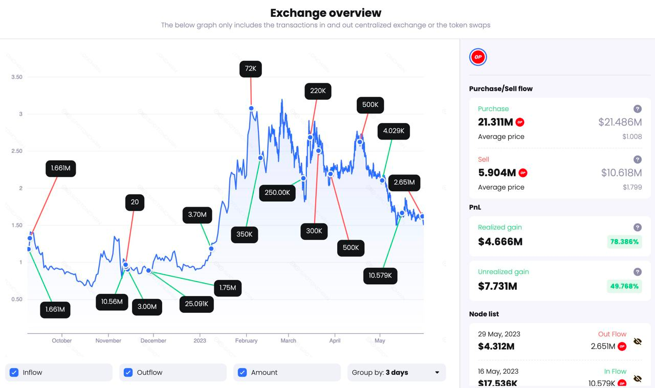 According to on-chain analyst Spot On Chain, Wintermute booked $4.67 million in profits from its OP token holdings. The decentralized finance (DeFi) market maker made a return on investment of 78.39% by selling 5.9 million tokens.