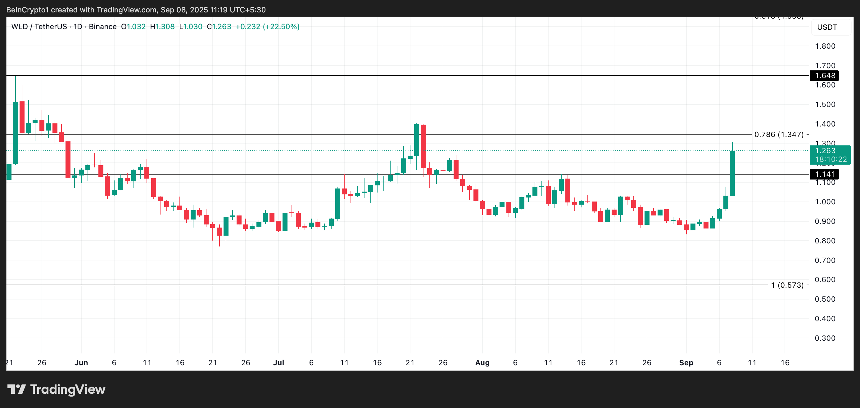 WLD rests significantly above the support floor formed at $1.14. If demand grows and this floor strengthens, WLD could break above the barrier at $1.34, opening the door for a rally toward $1.64.