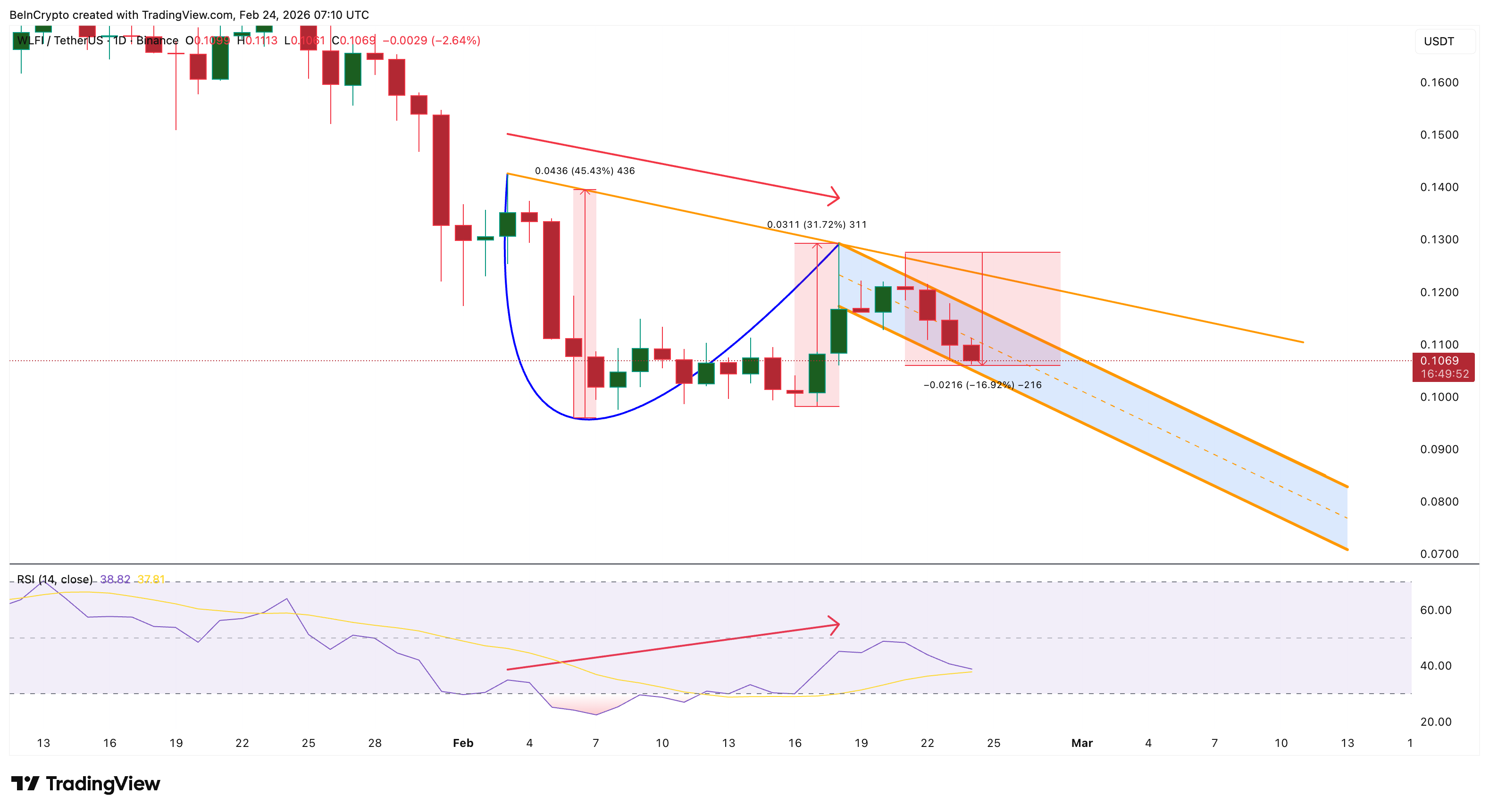 The Relative Strength Index (RSI), which measures momentum strength on a scale from 0 to 100, started rising between February 3 and February 18 even as WLFI’s broader trend remained weak. This created a hidden bearish divergence.