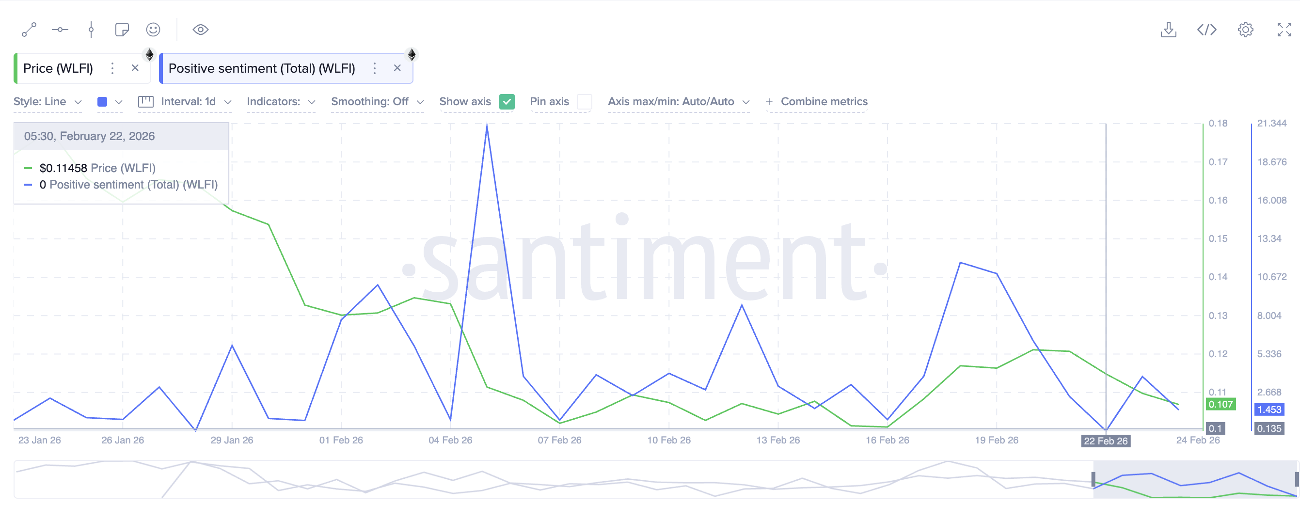 Investor sentiment also reflects this shift. Positive sentiment around WLFI had already been falling earlier this month as prices declined. It briefly recovered during the Mar-A-Lago rally but dropped again after the USD1 shock.