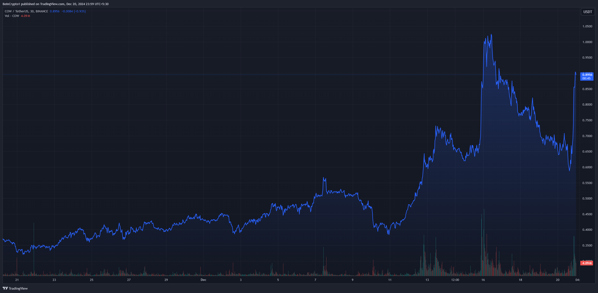WLFI’s investment patterns have triggered market rallies throughout December. Earlier this month, the project spent over $45 million, including purchases of Ethereum, Ondo (ONDO), and Ethena (ENA), pushing COW to $1.02, its highest value in over a year.