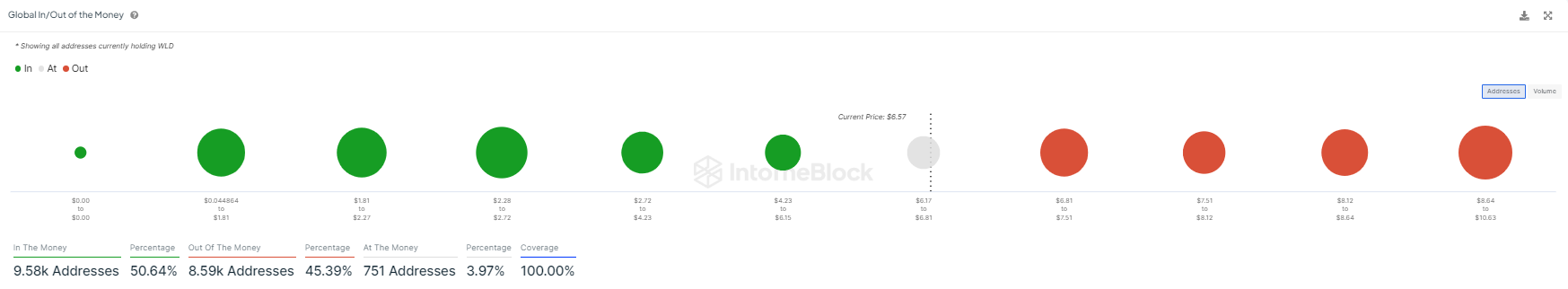 The Global In/Out of the Money (GIOM) data for WLD presents an even more compelling narrative. Over half of the current holders are ‘In the Money,’ with a price point well above their average purchase price. Key resistance can be found by holders that are ‘out of the money,’ with 2,150 addresses holding 6.3 million WLD at an average purchase price of $7.23.