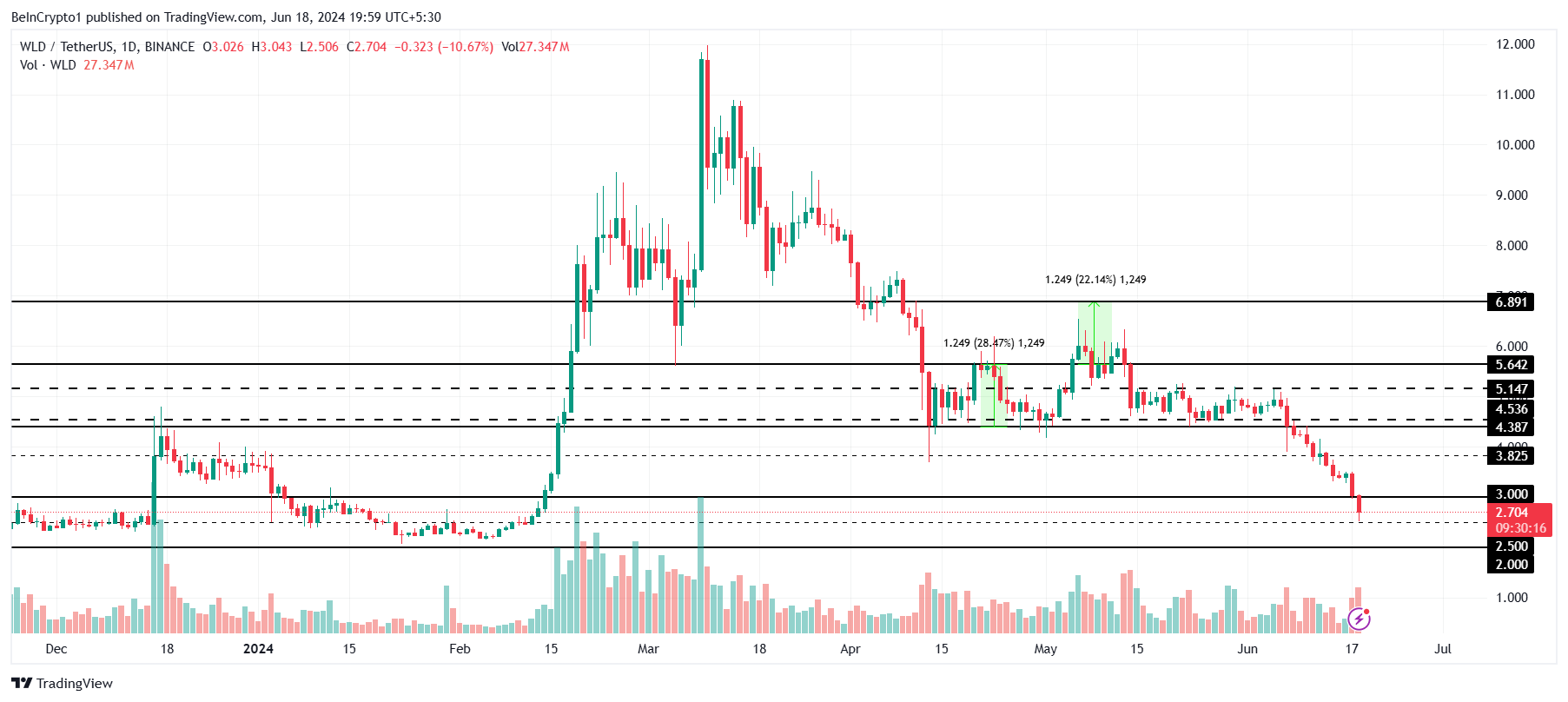 Worldcoin (WLD) price is forming lower lows on the daily chart as the broader market skepticism continues to grow.