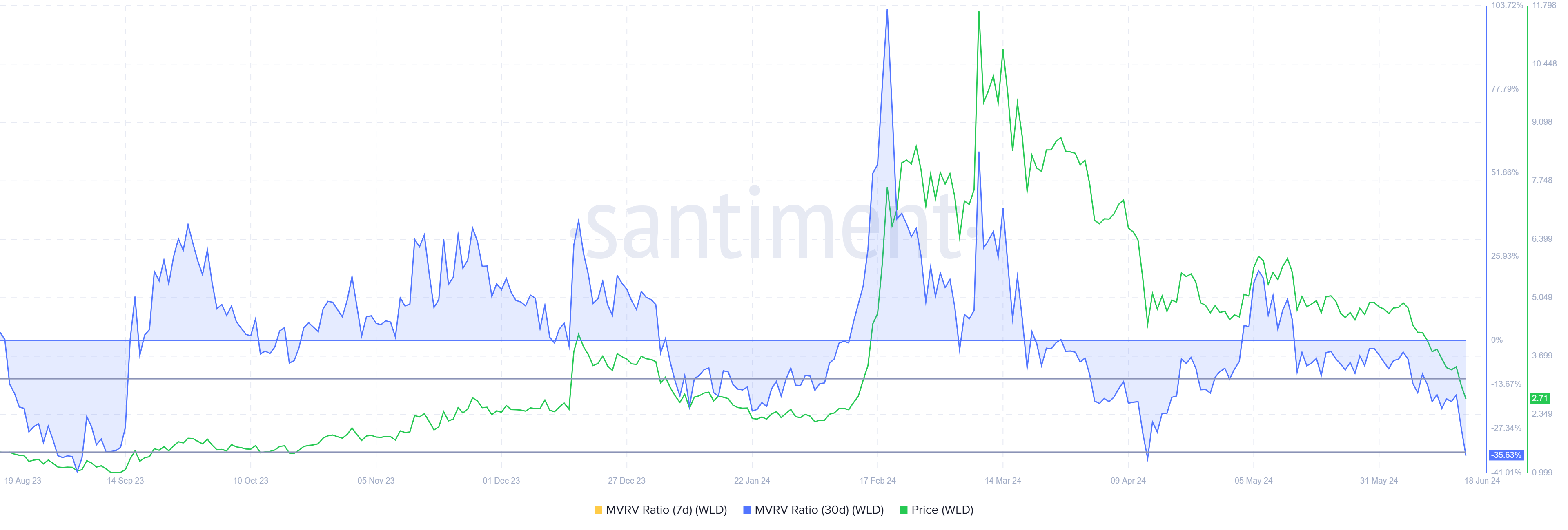 Combining that with the Market Value to Realized Value (MVRV) ratio provides an optimistic outlook. The MVRV ratio assesses investor profit and loss. Currently, Wordlcoin’s 30-day MVRV stands at -35%, indicating losses, which may lead to buying pressure.Â