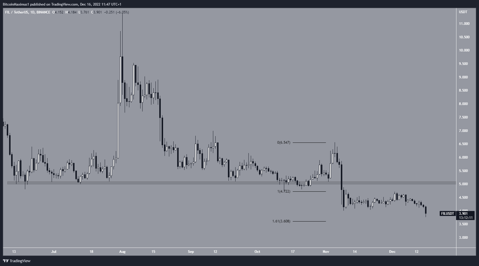 The downward movement has been ongoing since. On Dec. 16, FIL reached a low of $3.76. The trend is considered bearish until FIL reclaims the $5 area.