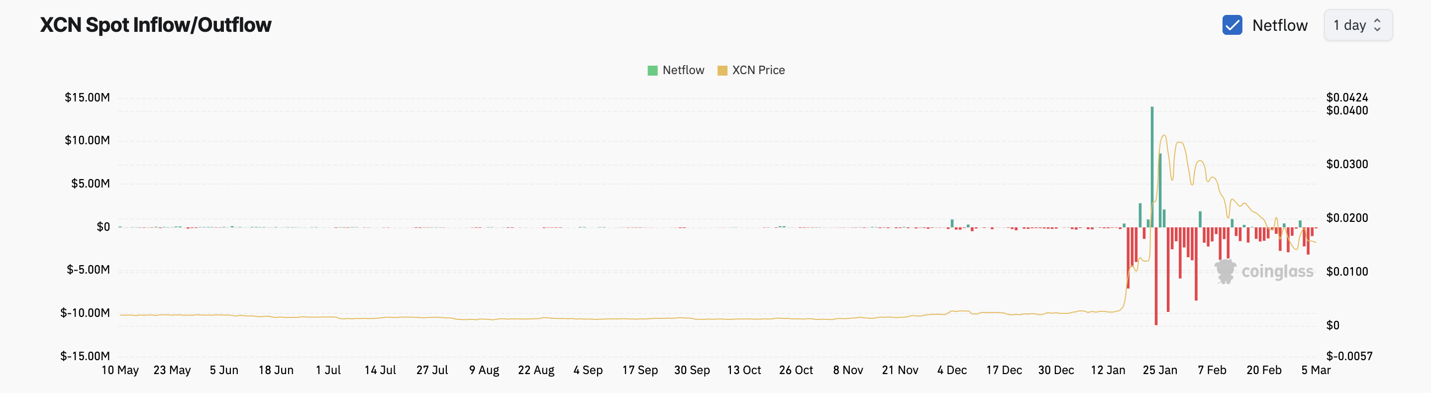 The steady outflows from XCN’s spot markets over the past month reflect the increased selling activity among its investors. Per Coinglass, in February, the altcoin only recorded four days of inflows, which totaled just $3.5 million. Conversely, XCN spot outflows exceeded $15 million during the same period.