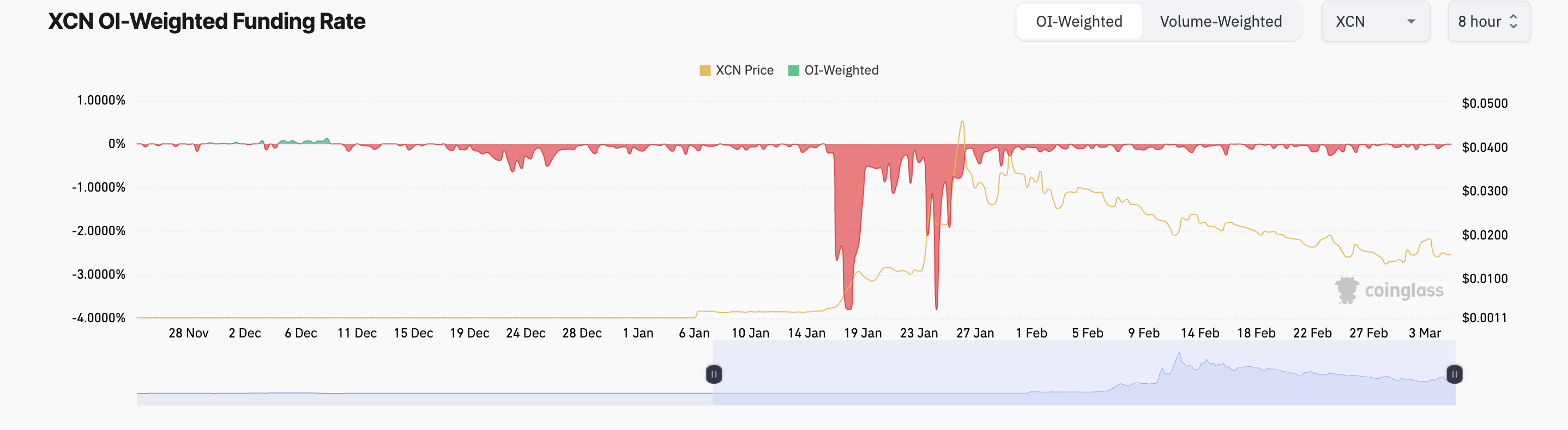Moreover, its funding rate has been predominantly negative since the beginning of the year, highlighting the bearish bias toward XCN.