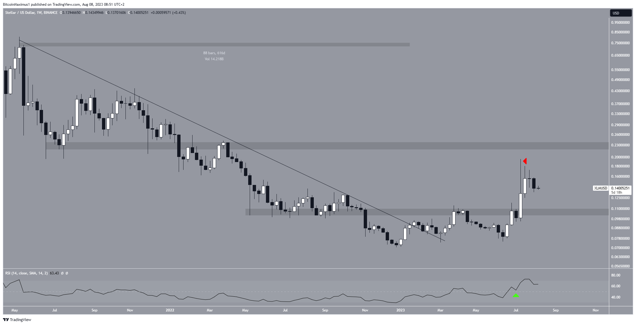 The weekly time frame technical analysis of XLM reveals several significant developments. The primary one is the breakout that occurred at the beginning of January, where XLM surpassed a descending resistance line that had been in place for 616 days.