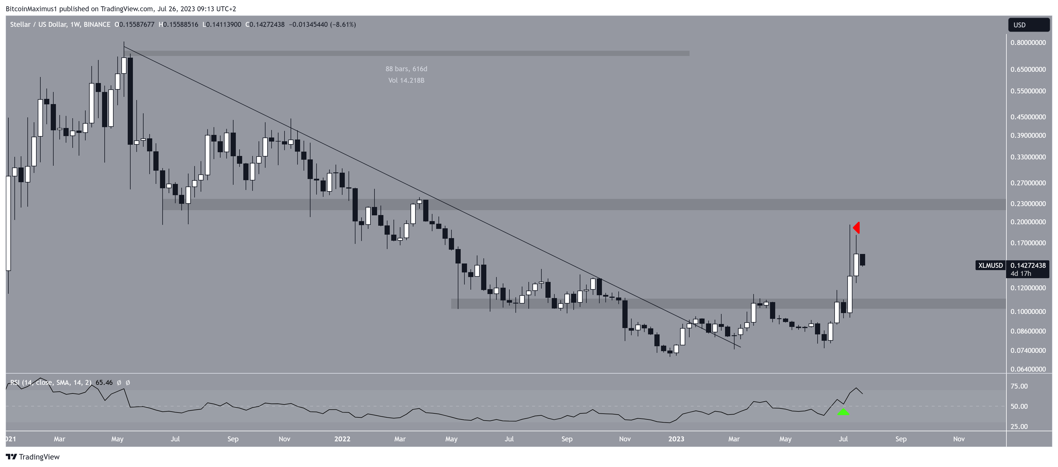 A look at the time frame technical analysis shows that XLM broke out from a 616-day resistance line at the beginning of January. After validating it as support two months later, it resumed its upward movement. Breaking through this significant long-term level often indicates the start of a bullish trend reversal.