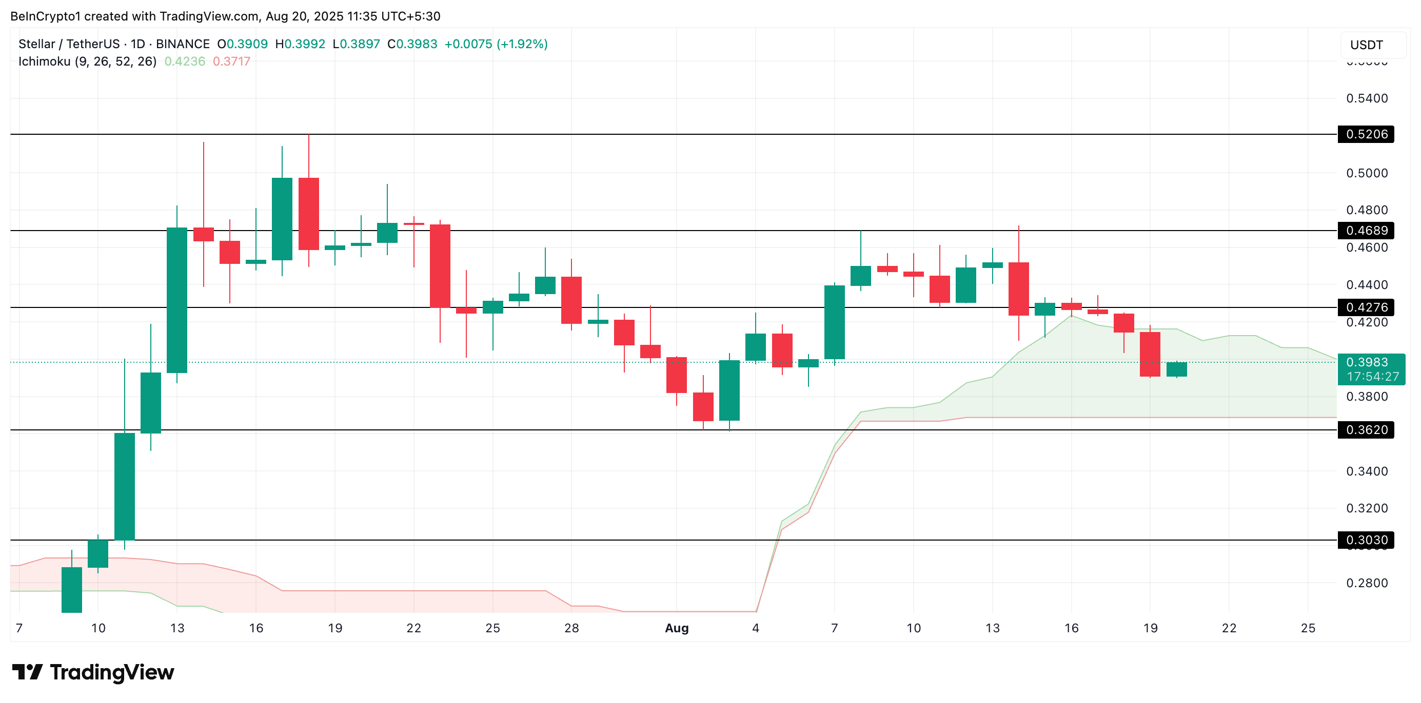 In this case, its price could fall toward $0.3717, where the Leading Span B still forms dynamic support. If this level fails to hold, XLM’s value could drop to $0.3620.