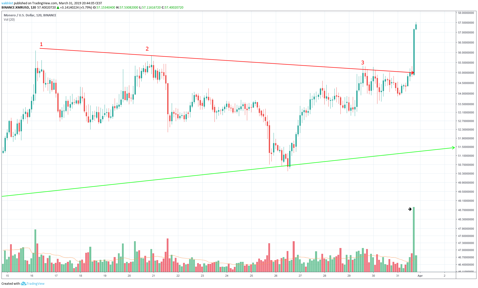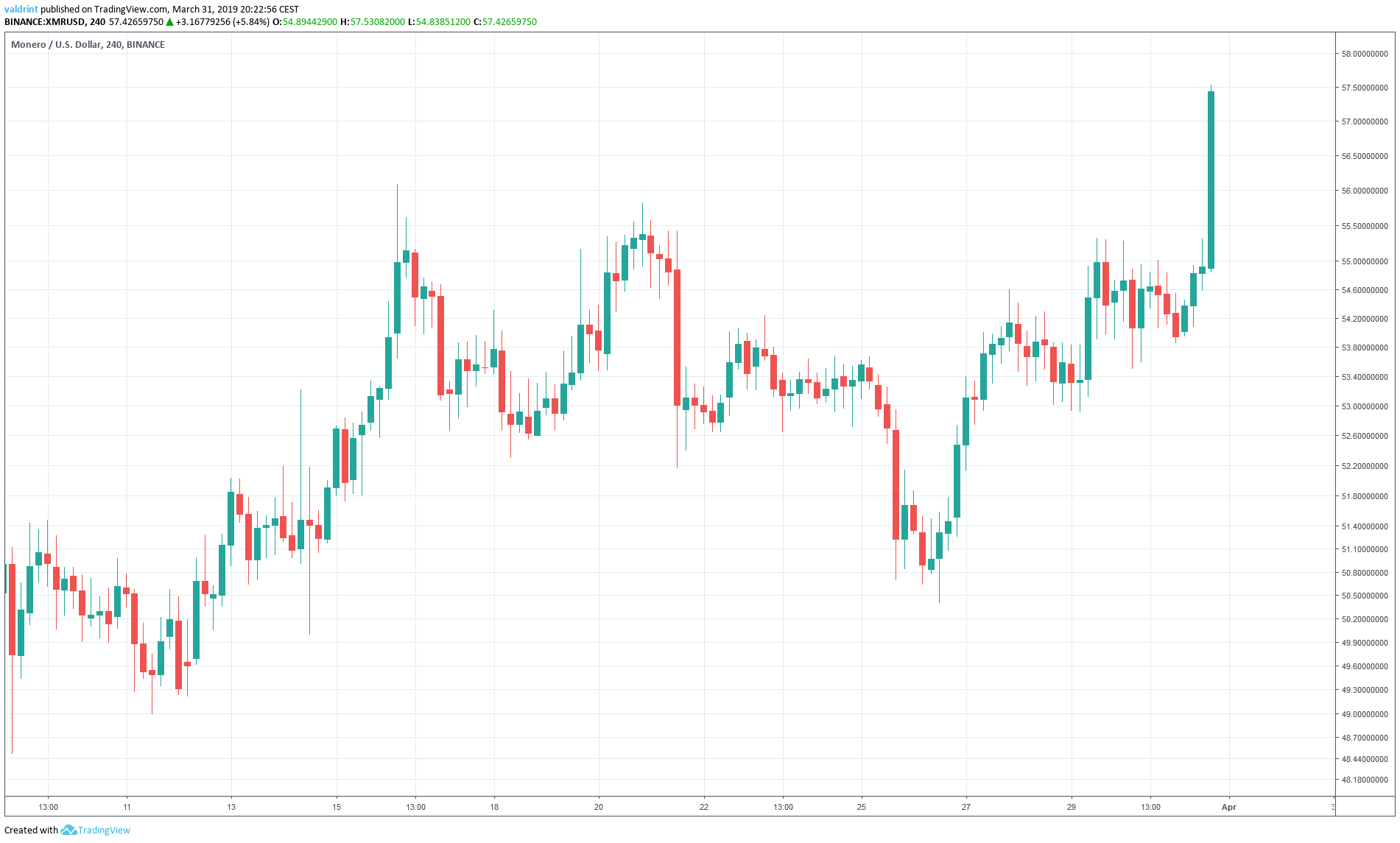 Subsequently, a gradual uptrend preceded a rapid price spike. At the time of writing on Mar 31, a high $57.53 was reached: