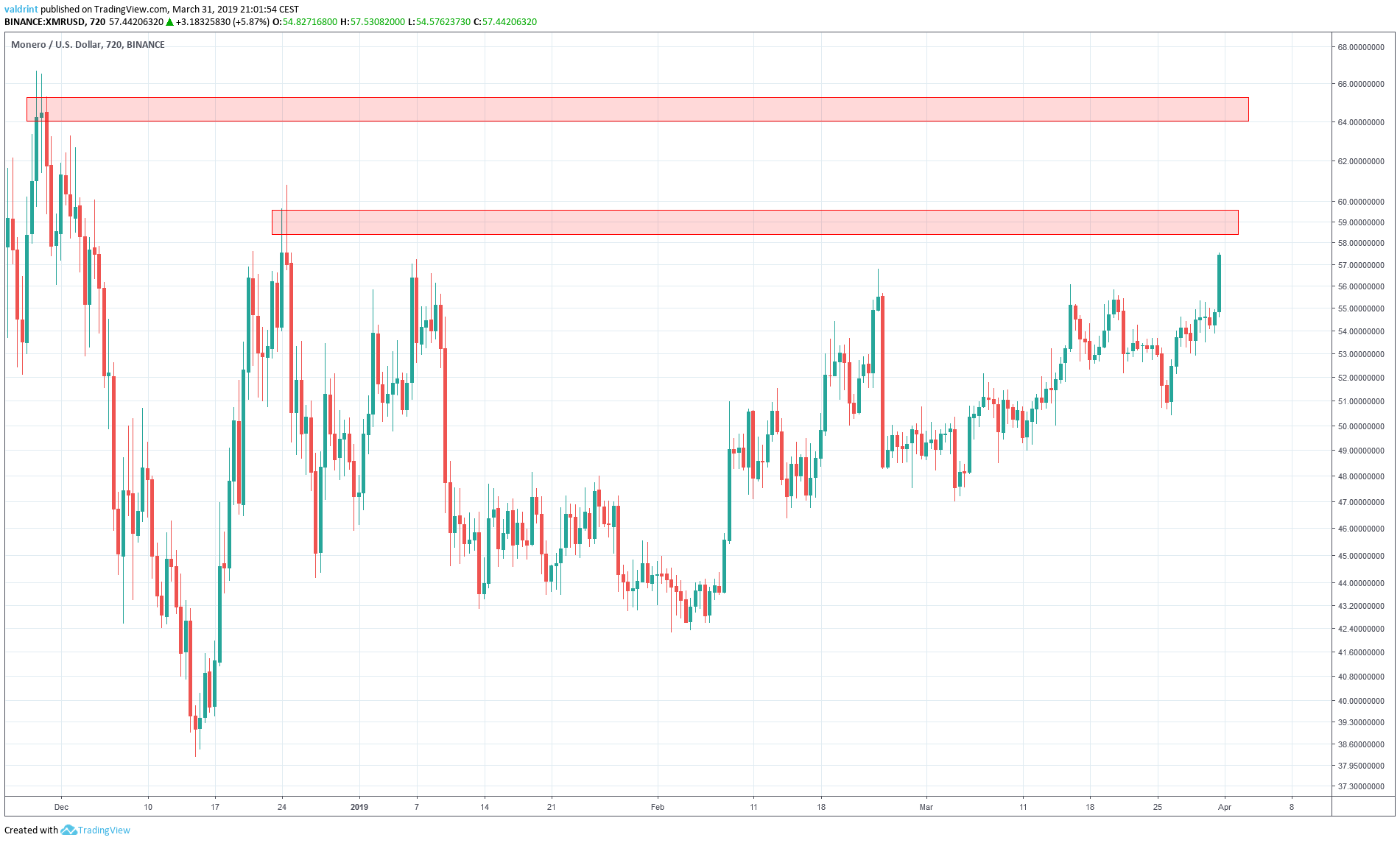 In order to better visualize possible future price levels, the price of XMR on Binance is analyzed at 12-hour intervals from Dec 1, 2018 to Mar 31, 2019 alongside resistance and support areas.