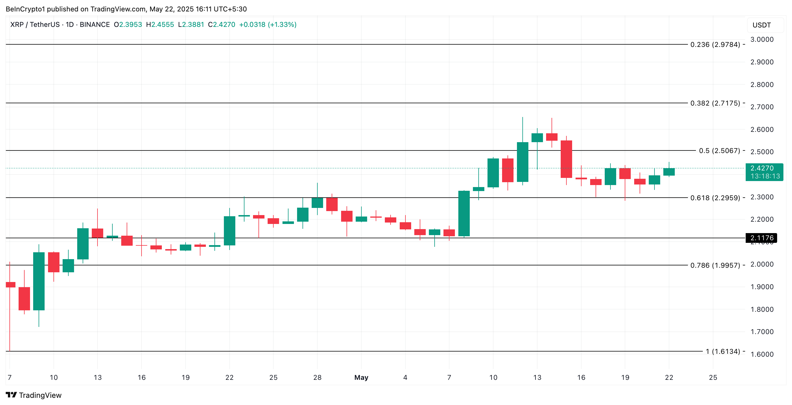 At press time, XRP trades at $2.42. With waning underlying demand for the fourth-largest crypto by market capitalization, the token is poised to lose some of its recent gains. In this scenario, XRP could fall to $2.29.
