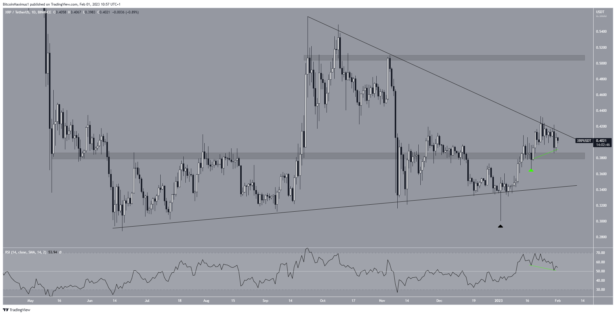 Over the past 24 hours, the XRP price has been rejected by the triangle and fallen. However, the daily RSI has generated a hidden bullish divergence (green line). This is a strong sign of trend continuation, which could lead to a breakout. If it does, $0.505 would be the next point of resistance.